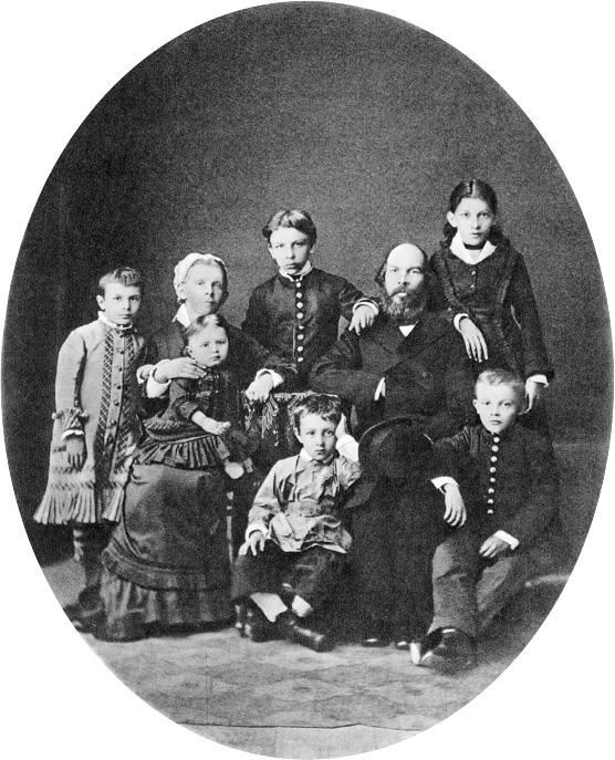 Фотопортрет семьи Ульяновых: Владимир, гимназист, сидит справа впереди; старший брат Александр, который в возрасте 21 года будет казнен как террорист, стоит слева от отца[6]