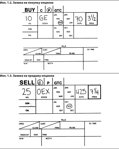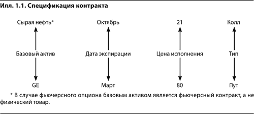 Примером биржевого опциона может служить торгуемый на New York Mercantile Exchange (NYMEX) октябрьский 21 колл на сырую нефть, который дает покупателю право занять длинную позицию в одном октябрьском фьючерсном контракте на 1000 баррелей сырой нефти (базовый актив) по цене 21 долл. за баррель (цена исполнения) в дату экспирации октябрьского опциона или до ее наступления. Тот, кто покупает на СВОЕ мартовский 80 пут на акции General Electric, имеет право занять короткую позицию в 100 акциях General Electric (базовый актив) по цене 80 долл. за акцию (цена исполнения) в дату экспирации мартовского опциона или до ее наступления.