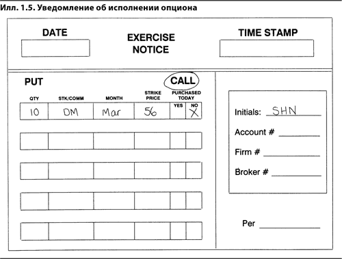 Трейдер, у которого есть опцион колл или пут, имеет право исполнить этот опцион до даты экспирации, превратив его тем самым в длинную позицию в базовом активе в первом случае или в короткую позицию во втором. Трейдер, исполняющий октябрьский 21 колл на сырую нефть, занимает длинную позицию в одном октябрьском фьючерсном контракте по цене 21 долл. за баррель. Трейдер, исполняющий мартовский 80 пут на акции GE, занимает короткую позицию в 100 акциях GE по цене 80 долл. за акцию. В случае исполнения опциона его действие прекращается, как и в случае истечения опциона без исполнения.