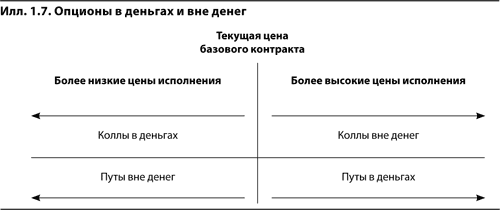 Строго говоря, цена исполнения опциона на деньгах равна текущей цене базового контракта. Однако в биржевой практике к категории «на деньгах» относят коллы и путы с ближайшей к текущей цене базового контракта ценой исполнения. Если акции стоят 74 долл., а цены исполнения изменяются с шагом в 5 долл. (65, 70, 75, 80), то опционами на деньгах будут считаться 75 колл и 75 пут, т. е. опционы колл и пут, цены исполнения которых наиболее близки к текущей цене базового контракта.