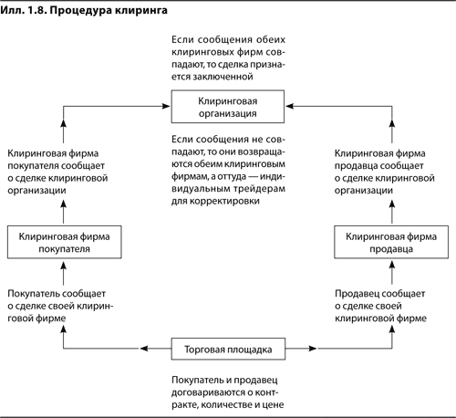 Если индивидуальный трейдер не может выполнить условия контракта, то ответственность ложится на его клиринговую фирму. Клиринговая фирма – это член биржи, который обрабатывает заключенные индивидуальным трейдером сделки и соглашается взять на себя ответственность за выполнение всех вытекающих из этих сделок финансовых обязательств. Никто не может торговать на бирже без предварительного заключения договора о клиринговом обслуживании с одной из клиринговых фирм.