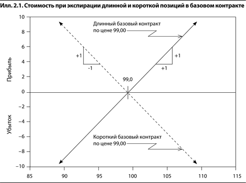 На илл. 2.1 показана стоимость при экспирации как длинной, так и короткой позиции в базовом контракте в предположении, что сделка заключена по текущей цене 99,00. По горизонтали отложены цены базового фьючерсного контракта, а по вертикали – прибыли или убытки по нашей позиции. Обратите внимание на то, что график представляет идущую под углом 45° прямую, не ограниченную ни в одном из направлений[5]. Это означает, что потенциальная прибыль или убыток по каждой позиции неограниченны. Заметьте также, что соотношение между изменением цены базового контракта и соответствующим изменением стоимости позиции равно 1:1. Если мы займем длинную позицию, то будем получать прибыль в размере одного пункта на каждый пункт роста цены базового контракта; на каждый пункт падения цены базового актива мы будем терять один пункт. Если мы займем короткую позицию, то все наоборот – на каждый пункт роста (снижения) цены базового контракта мы будем терять (получать) один пункт.