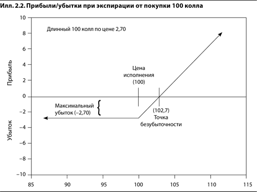 Используя тот же метод оценки, мы показываем на илл. 2.2 прибыли или убытки при экспирации от покупки 100 колла по цене 2,70. Обратите внимание, что в этом случае график уже не прямая линия. Если цена базового контракта упадет при экспирации ниже 100, то 100 колл окажется вне денег, его стоимость станет нулевой, и мы потеряем 2,70, которые заплатили за этот колл. При цене базового контракта свыше 100 этот опцион будет в деньгах, а его стоимость будет расти вместе с ценой базового контракта – на один пункт на каждый пункт роста стоимости базового контракта. Если к дате экспирации цена базового контракта достигнет 102,70, то стоимость 100 колла будет равна его внутренней стоимости, т. е. 2,70, и наши прибыль/убыток окажутся нулевыми (102,70 – это точка безубыточности для данной позиции). Выше 102,70 прибыль от покупки 100 колла будет потенциально неограниченной, точно так же, как и прибыль от длинной позиции в базовом контракте.