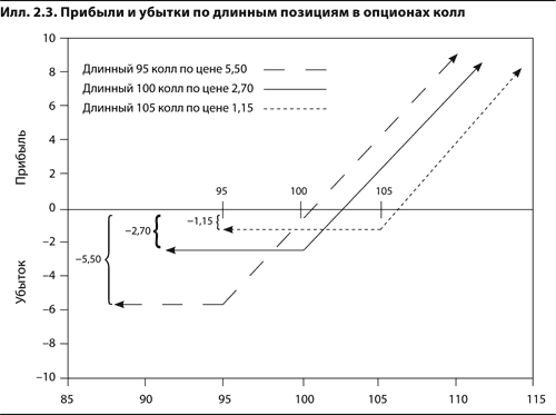 График прибылей/убытков по длинной позиции в опционе колл на момент экспирации всегда имеет ту же форму, что и график на илл. 2.2. Для этой позиции характерны ограниченный убыток при снижении цены базового контракта и неограниченная прибыль при ее росте. Точка графика, в которой убыток становится максимальным (точка изгиба), зависит от цены исполнения и цены опциона. На илл. 2.3 показаны графики прибылей и убытков по длинным позициям в опционах колл с ценами исполнения 95, 100 и 105.