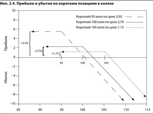 На илл. 2.4 показаны прибыли и убытки по коротким позициям в коллах с ценами исполнения 95, 100 и 105. Как видим, эти графики являются зеркальным отражением графиков на илл. 2.3. Прибыль от таких позиций ограничена суммой премии, за которую эти опционы были проданы, а неограниченный риск потерь при росте цены базового контракта аналогичен риску, характерному для короткой позиции в базовом контракте.