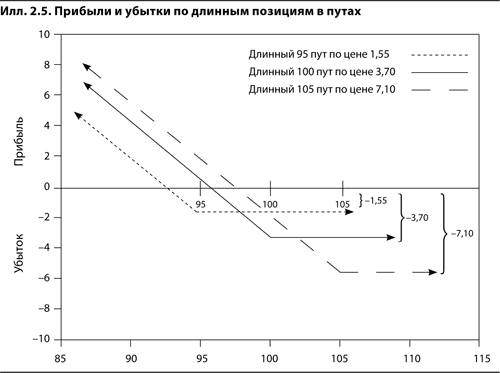 Иллюстрация 2.5 дает представление о прибылях и убытках по длинным позициям в путах с ценами исполнения 95, 100 и 105. Соотношение риск / потенциальная прибыль для данных позиций аналогично соотношению для длинных позиций в коллах, но здесь ограниченный риск связан с повышением цены, а неограниченная прибыль – с ее понижением. Результат покупки опциона будет нулевым, если цена базового контракта окажется ниже цены исполнения ровно на величину цены данного опциона (иными словами, для опциона пут точка безубыточности расположена левее страйка на величину премии). Ниже точки безубыточности потенциальная прибыль от позиции не ограничена и увеличивается на один пункт на каждый пункт снижения цены базового контракта.