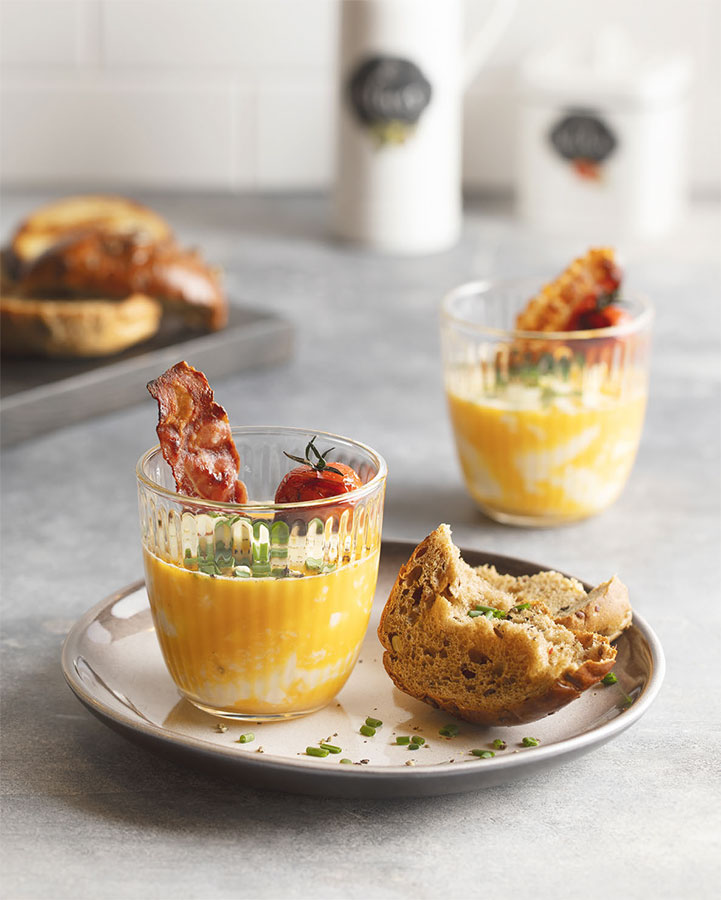 Яйца очистите, разложите по стаканчикам и с помощью ложки взболтайте. Посолите, поперчите по вкусу, положите хрустящий бекон и жареный черри. По желанию посыпьте мелко порезанным зеленым луком.