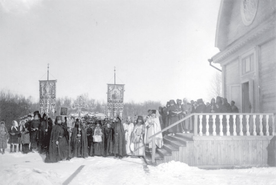 Крестный ход в Печенгском монастыре (игумен Иакинф в центре на ступенях храма)