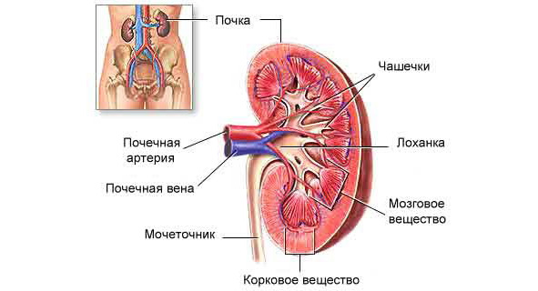 ПОЧКИ (лат. ren) – парные органы бобовидной формы, располагаются вне брюшной полости, позади нее, в поясничной области, по обе стороны от позвоночника. Каждая почка достигает в длину около 12 см, в ширину 5—6 см, в толщину 3—4 см. Масса одной почки приблизительно 150 г.