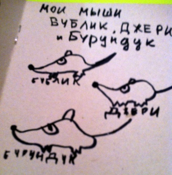 Василиса (тогда ей было 9 лет) по дороге на хор рассказала мне сюжет волшебной истории. Героями ее стали три мыша-песчанки, три друга. Вот, кстати, и они (иллюстрация Василисы):
