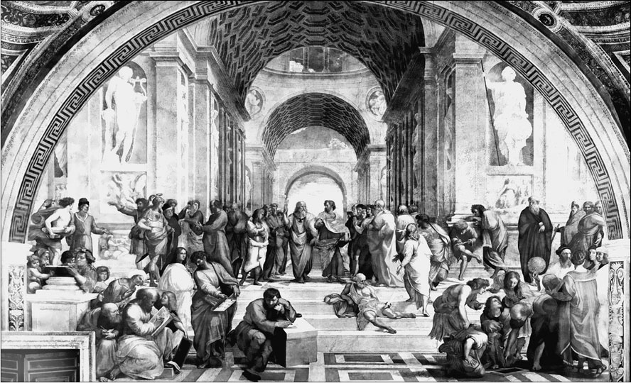 Между историками культуры и литературы имеется мало согласия в том, что именно в сочинениях великого философа произвело наиболее сильное впечатление на его учеников начала нашего времени, но был среди них один, который, по моему глубокому убеждению, был настолько вдохновлён Платоном, что предоставил нам некоторые ключи к разгадке. Одна из четырёх великих фресок Рафаэля, написанных на стенах знаменитой Станца делла Сеньятура в Ватикане, называется «Афинская школа»{19}. Центральными фигурами этой вдохновенной композиции являются Платон и Аристотель. Каждый из них держит книгу, которая, как полагали тогда, наиболее характерна или важна среди трудов философов. Аристотель несёт свою «Этику», тогда как Платон – не «Законы», не «Республику», но – «Тимея»! Может показаться необычным, что из многих работ Платона была выбрана одна-единственная, поскольку во времена Рафаэля принципы космологии и физики, изложенные в «Тимее», были уже во многом пересмотрены.