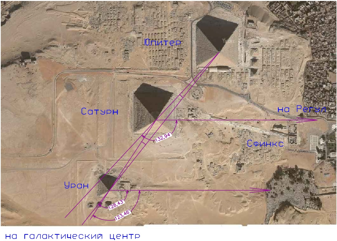 Разница между линией соединения Сатурна и Урана, а она является определяющей мы это разберем в последующих главах, и направлением на звезду Регул относительно ГЦ составляет 123024,4/. На схеме расположения пирамид и Сфинкса 123027,6/. При этом Юпитер немного отстает на обеих схемах.