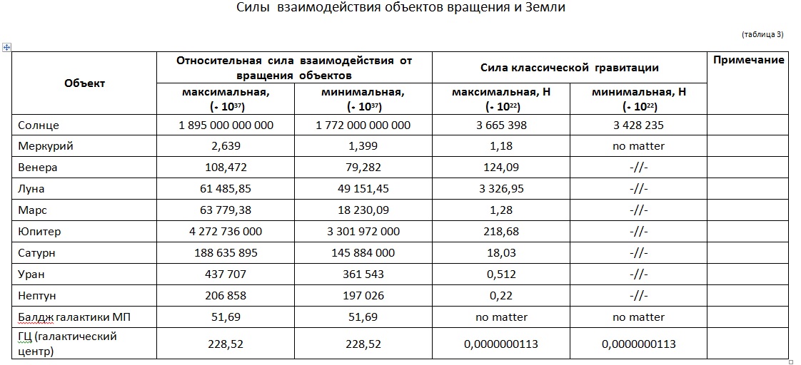 Для расчетов в таблице 1 собраны физические данные объектов вращения. Далее по вышеприведенным формулам получаем сравнительные характеристики объектов вращения и сводим их в таблицу 2. Прошу обратить внимание, автор вводит новый объект в Астрологию – Галактический Центр, но обо всем по порядку.