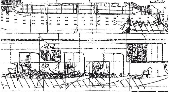 Самые крупные суда не были самоходными. Их буксировали более мелкие суда со своими командами гребцов и, возможно, одним парусом. Около 2400 года до н. э. египтяне построили крупное судно, которое, вероятно, имело длину около 100 футов. Иными словами, оно было длиннее корабля «Мейфлауэр», который в 1620 году привез отцов-пилигримов в Массачусетс. Оно имело длину 90 футов. Судно 1600 года до н. э., перевозившее два обелиска, уложенные на главной палубе, имело длину не менее 220 футов (рис. 2.6). Потребовалось три группы более мелких весельных судов, чтобы отбуксировать его с грузом вниз по Нилу. В общем, какими бы ни были размеры древних судов, они приводились в движение в основном мускульной силой человека.