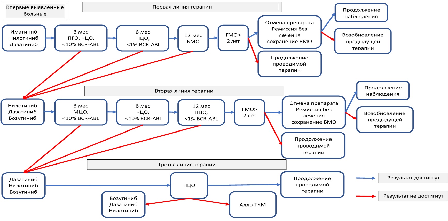 • в любое время после года терапии достижение БМО (на 3 месяца терапии достижение раннего молекулярного ответа (BCR::ABL ≤ 0,1 %).