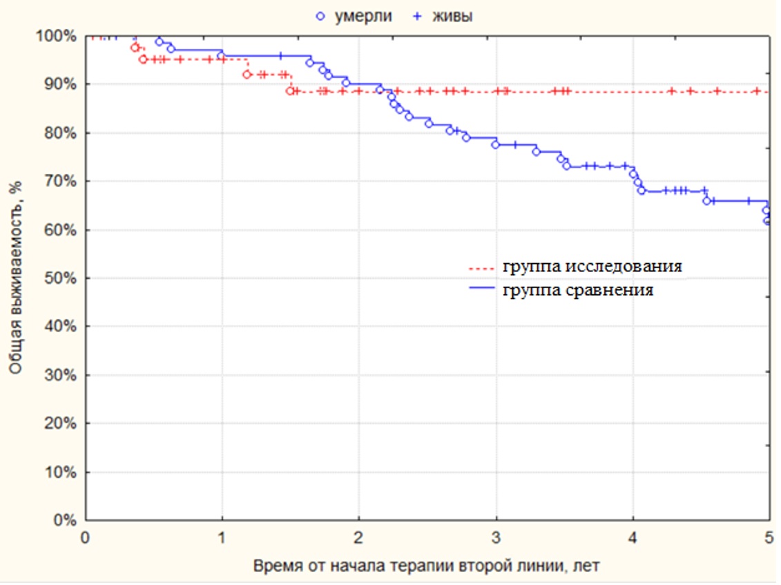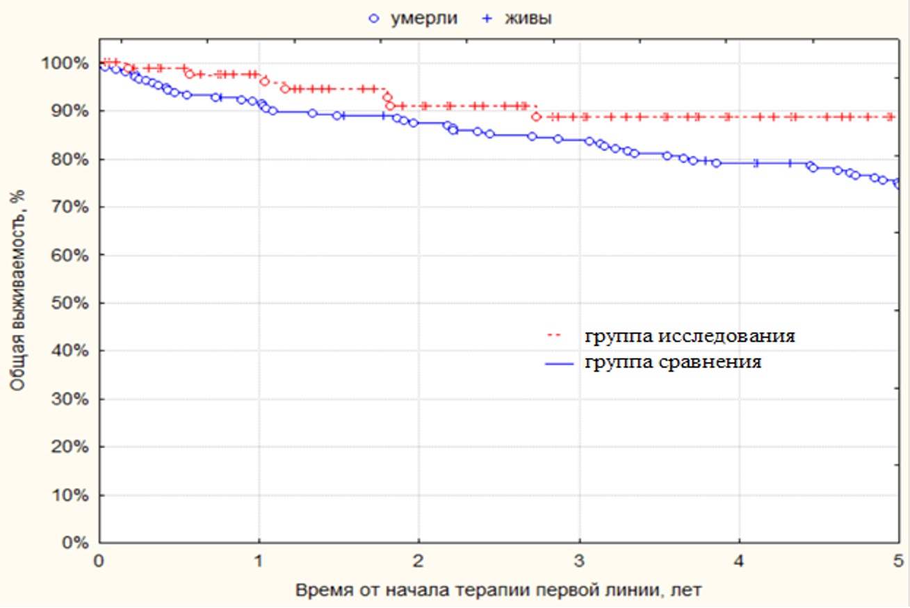Общая выживаемость была статистически значимо (p=0,0005) выше в группе исследования по сравнению с группой сравнения: 5-летняя ОВ составила соответственно 88 % и 63 % (рисунок II-4).