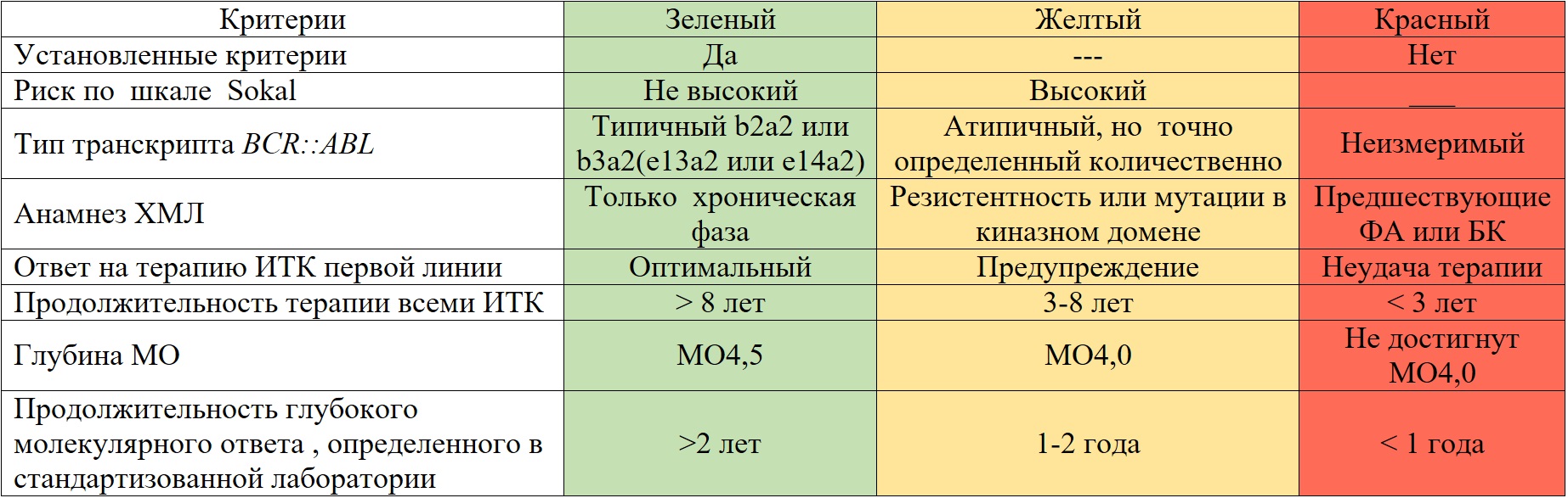 В этом случае лечение ИТК прекращалось и проводился мониторинг уровня BCR::ABL с момента прекращения приема ИТК по следующей схеме: в течение первых 6 месяцев 1 раз в месяц; в течение второй половины первого года (с 7-го до завершения 12 месяца) 1 раз в 1,5 месяца; затем 1 раз в 3 месяца.