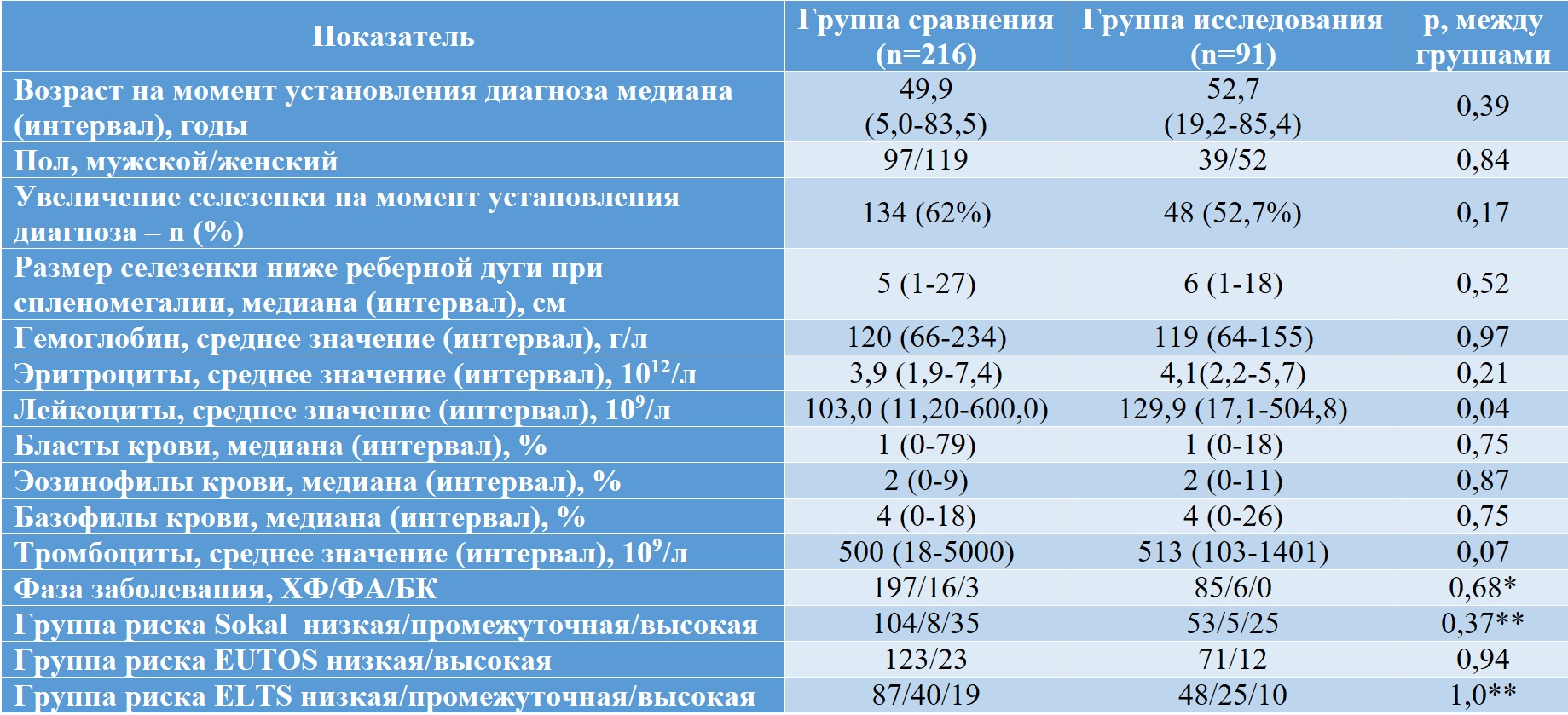 Всего в исследование было включено 307 пациентов с диагнозом ХМЛ. Группа сравнения (исторического контроля) состояла из 216 больных, 91 пациент был включен в группу исследования. Результаты первичной диагностики приведены в таблице II-16.