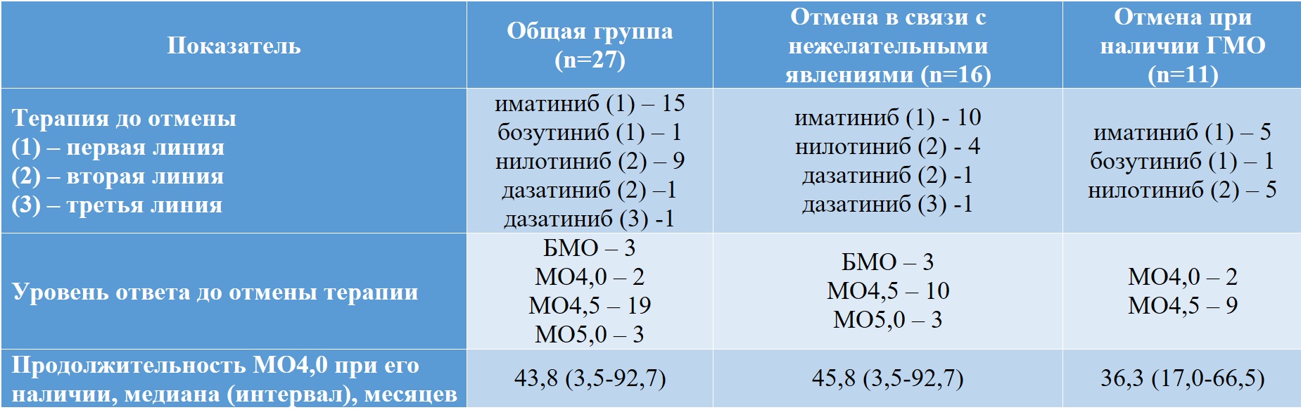 Причинами отмены терапии были: нежелательные явления у 16 больных, наличие глубокого молекулярного ответа у 11 пациентов, давших информированное согласие. Клинические данные пациентов представлены в таблице II-17.