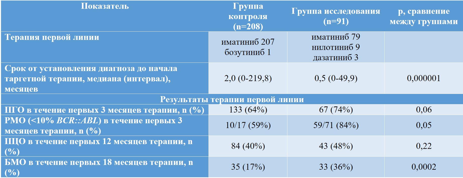 Особенностью разработанной программы лечения ХМЛ было использование раннего переключения между линиями таргетной терапии при отсутствии оптимального ответа на таргетную терапию.