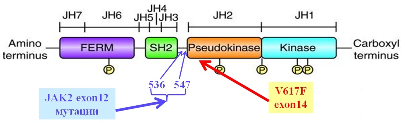 Janus-киназа является представителем семейства нерецепторных тирозинкиназ. Мутация вызывает замену 1849 нуклеотида G→T, которая в свою очередь приводит к замене в 14 экзоне гена JAK2 фенилаланина на валин в кодоне 617. Молекулы содержат около 1100 аминокислот с общей массой 120–140кДа. Структурно они состоят из семи гомологичных участков, формирующих четыре домена: киназный (JH1), псевдокиназный (JH2), домен с гомологией Sarc онкобелка (SH2), FERM домен. Первый с углеводного окончания молекулы домен (JH1) является типичной тирозинкиназой с каталитической активностью и очень схож с каталитическим доменом тирозинкиназ эпидермального ростового фактора. Следующий домен (JH2) структурно похож на тирозинкиназный домен, но лишен каталитической активности и выполняет регуляторные функции активности [19]. Эта особенность в виде двух похожих участков дала название всему семейству, посвященное древнеримскому богу Янусу, имевшему два лица. SH2 домен облегчает связывание других белков с JAK, домен FERM, расположенный с аминокислотного окончания молекулы и взаимодействует с трансмембранными белками – рецепторами некоторых цитокинов, регулируя активность JAK-киназы [20, 21].
