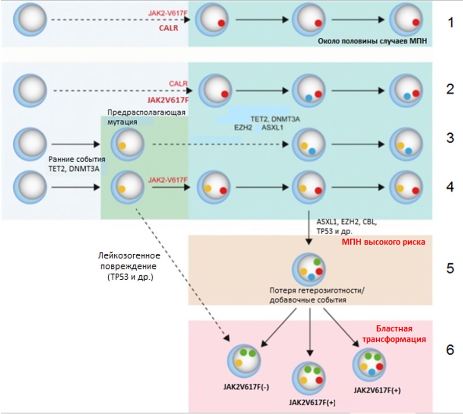 1 – МПН с низким риском прогрессии (ИП, ЭТ); 2 – «продвинутые» формы МПН (ПМФ); 3 – три-негативные МПН; 4 – МПН из клона с повышенным миелопролиферативным потенциалом; 5 – МПН высокого риска с большой мутационной нагрузкой; 6 – бластная трансформация