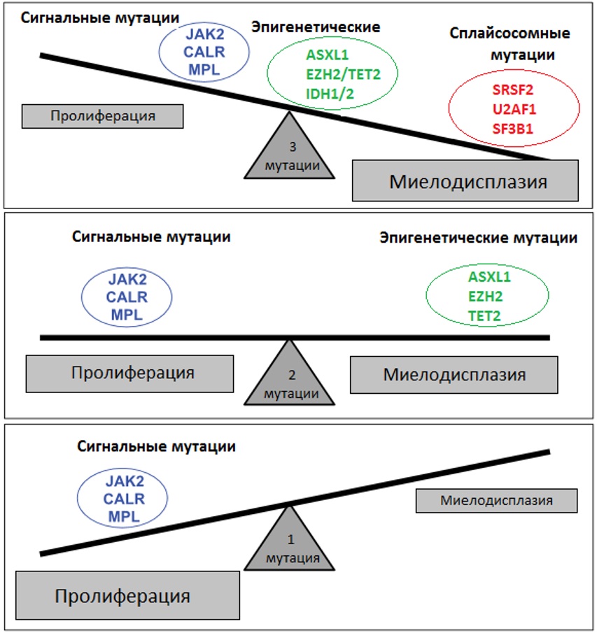 Полагают, что во всех случаях CALR+ МПН мутация данного гена является самым ранним инициирующим событием. При этом появление дополнительных мутаций (TET2, DNMT3A, EZH2, ASXL1 и др.) приводит к развитию более «продвинутых» форм МПН, таких как ПМФ, и ухудшению прогноза. Пациенты без наличия мутаций в генах JAK2 и CALR могут быть носителями клона, первоначально не являющимся патологическим, но обладающим повышенным пролиферативным потенциалом (вследствие мутаций ТЕТ2, предрасполагающего гаплотипа, неизвестных до настоящего времени мутаций). Появление новых соматических мутаций в генах JAK2, DNMT3A, EZH2, ASXL1 и др. приводит к быстрой манифестации признаков МПН и ухудшению прогноза. Если добавочным событием в клетках, несущих «предрасполагающую» мутацию, будет лейкозогенное повреждение (например, мутация TP53), то возможно развитие ОМЛ de novo без стадии МПН. Бластной трансформации МПН способствует последующее накопление мутаций в генах, участвующих в процессах дифференцировки и регуляции клеточного цикла (EZH2, ASXL1, IDH1/2, CBL, TP53). При этом большинство данных мутаций может обнаруживаться задолго до развития бластного криза. Вероятно, пусковым звеном бластной трансформации при этом будет вовлечение в процесс пока еще не исследованных мутаций или потеря гетерозиготности (например, по ТР53).
