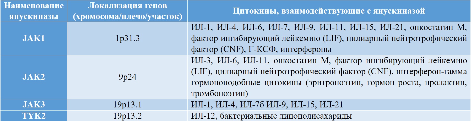 Впервые в эволюционном отношении Janus-киназы возникают у примитивных хордовых. У млекопитающих семейство Janus-киназ представлено четырьмя белками: JAK1, JAK2, JAK3 и TYK2. В настоящее время JAK2V617F мутация описана не только при ИП, но и при других миелоидных новообразованиях. Однако она никогда не определялась у пациентов с опухолями лимфатической ткани, эпителиальными опухолями и саркомами [22]. Локализация генов, кодирующих соответствующие белки и участие в сигнальных путях конкретных цитокинов приведены в таблице III-1.