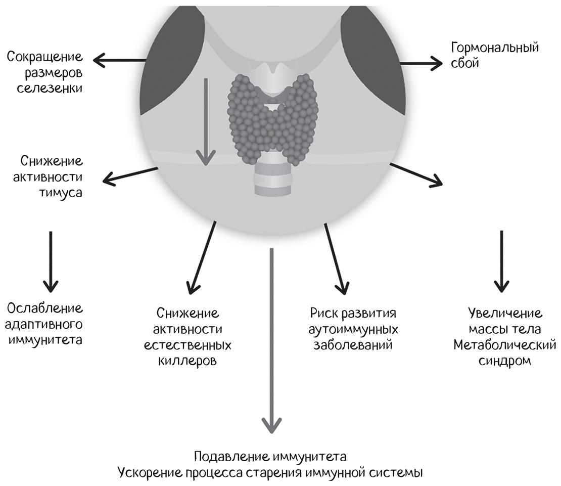 Гормоны и их побочные продукты функционируют как иммуномодуляторы, оказывая влияние на выносливость организма. Женские половые гормоны, например, эстрогены, обладают иммуностимулирующими свойствами, [122] а мужские половые гормоны, такие как тестостерон, выступают в качестве иммуносупрессоров. [123] Другие гормоны, типа гормонов щитовидной железы, гормона роста человека, IGF-1 (инсулиноподобный фактор роста-1 – прим. пер.) и пролактин также оказывают влияние на иммунную систему. [124] Более того, для правильного функционирования продуцирующих гормоны ферментов необходимы витамины и минералы. В случае с тиреоидными гормонами эта миссия ложится на йод, что подтверждает крайне важное положение микроэлементов в вопросе укрепления иммунитета.