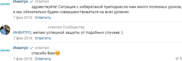 Команда MarkwayПоказательный пример – реакция «Инвитро» на кибератаку в середине 2017 года. Из-за масштабного сбоя в работе компьютеров, вызванного вирусом Petya, в работе компании возникли перебои, угроза сохранности материалов и персональных данных. Но корректная стратегия реакции на кризис обратила ситуацию организации на пользу.