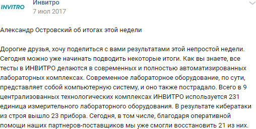 Построение истории. Компания не только показала, как справляется с возникшими трудностями, но и предоставила клиентам завершенную историю успешного выхода из кризиса. Более того, «Инвитро» проявила креатив и через полгода даже открыла памятник вирусу Petya.