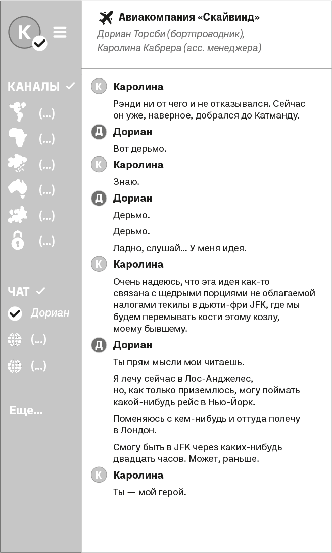 У них с Дорианом имелось в аэропорту свое излюбленное место, Каролина была уверена, что в это время суток там никого нет и Дориан сможет отдохнуть, прежде чем полетит обратно в Лондон попутным рейсом. Идеальное укрытие для спокойной беседы без чужих глаз: небольшой зал ожидания в транзитной зоне для ВИП-клиентов авиакомпании «Скайвинд», расположенный в непосредственной близости к салонам и частным кафешкам. Ближе к утру здесь пусто, поскольку гости давно уже легли спать в своих индивидуальных комнатах со всеми удобствами – с постелью, душем и индивидуальным обслуживанием из ресторанов и кафе. Они с Дорианом далеко не в первый раз проводили там время и долгими часами сидели неподвижно, удобно устроившись в регулируемых раскладных креслах, глядя в огромную стеклянную стену с великолепным панорамным видом на взлетно-посадочную полосу.