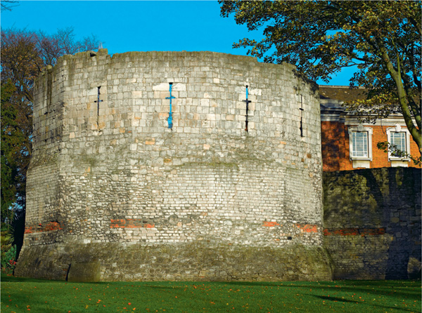 Fig. 1 The Multangular Tower, York. The lower part of this fourteen-sided tower dates from the late 3rd or early 4th century and formed part of the Roman fortress of York. The upper stages were rebuilt and reused in the 13th century. Throughout the early Middle Ages large Roman structures such as this dominated many English towns.