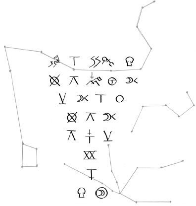 She studied them now, strange icons that looked like no language she had ever seen with the lines of different constellations weaving in and out of them: Draco, Taurus, the Plough.