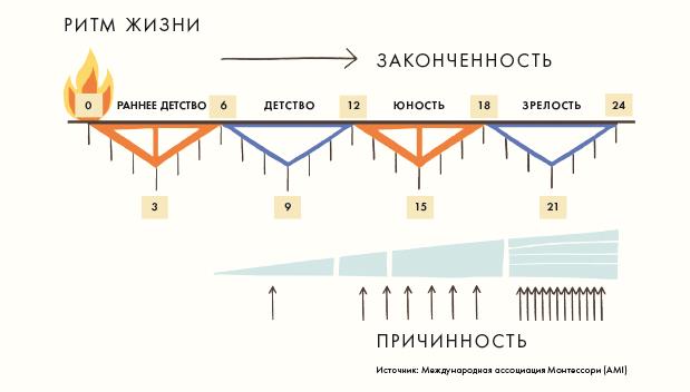 Доктор Монтессори заметила, что развитие человека происходит циклически: периоды быстрого роста сменяются периодами консолидации. Это противоречило более распространенному в то время убеждению, что становление человека идет по линейному пути, при котором самые младшие учащиеся учатся хуже всех, а старшие в наибольшей степени способны к обучению. Этот традиционный взгляд показан в нижней части диаграммы (синие треугольники показывают объем обучения начиная с 6 лет, который увеличивается вплоть до поступления в колледж).