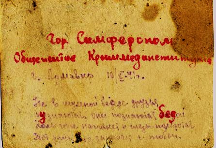 На этой фотографии, на обратной стороне надпись, бабушкиным почерком: «гор. Симферополь. Общежитие Крым мединститута». (под окнами – бульвар Ленина, именно тут шли танки) И вторая надпись, тоже бабушкиной рукой, но другими чернилами и, очевидно, сделанная в указанную дату: «Армавир 10/Х-41 г. Не в шумной беседе друзья узнаются. Они познаются бедой. Коль горе нагрянет и слёзы польются, Тот друг, что заплачет с тобой.» Эти немудреные, и в то же время, очень точные слова – то, что было тогда в сердце у 20-летней Лидочки…