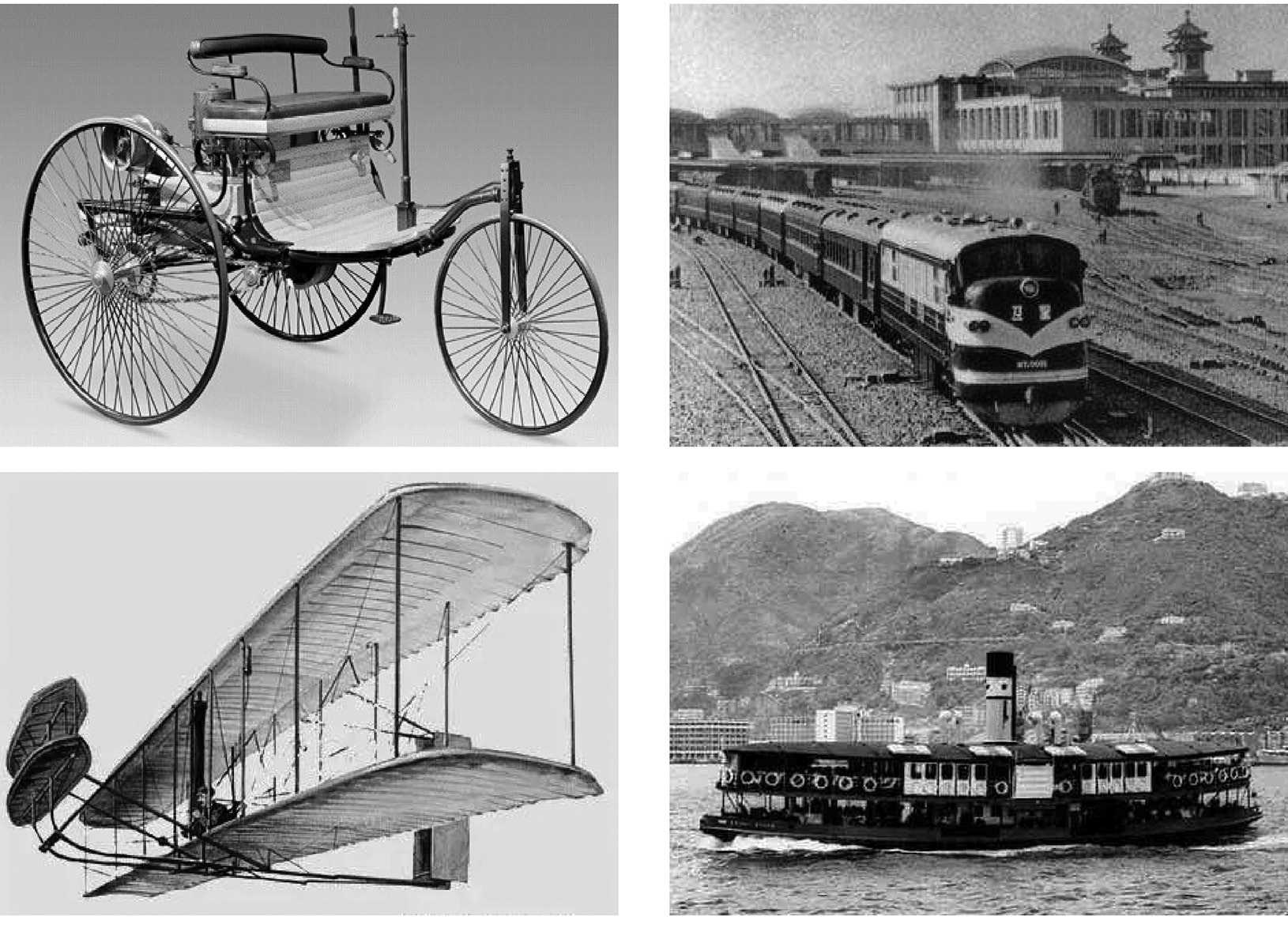 Взаимопревращение электрического и магнитного полей закладывает теоретическую основу для создания электромобилей. В середине 1880-х годов немецкий изобретатель Карл Бенц предложил конструкцию легкого двигателя внутреннего сгорания, работавшего на бензине в качестве топлива. Изобретение двигателя внутреннего сгорания решило проблемы автомобильных двигателей и вызвало революционные изменения в сфере транспорта. Технологией, способствующей наступлению эры электрификации, стало сочетание технологии производства двигателя внутреннего сгорания с технологией обрабатывающей и нефтехимической промышленности, что привело к формированию второй промышленной революции за счет сжигания вторичных источников энергии. В конце XIX века появился новый вид транспорта – автомобиль. В 1880-х годах немец Карл Бенц успешно изготовил первый автомобиль с бензиновым двигателем внутреннего сгорания. В то же время многие страны начали создавать свою автомобильную промышленность. В дальнейшем продолжали появляться и тепловозы, океанские корабли, самолеты и т. д. с двигателями внутреннего сгорания. В 1894 году Германия успешно разработала первый локомотив внутреннего сгорания с бензиновым двигателем и применила его на железнодорожном транспорте. 17 декабря 1903 года самолет, изготовленный братьями Райт в США, успешно совершил испытательный полет, осуществив мечту человечества о полете в небе и ознаменовав новую эру транспорта. Первые автомобили, поезда, самолеты и корабли показаны на рис. 1-11.