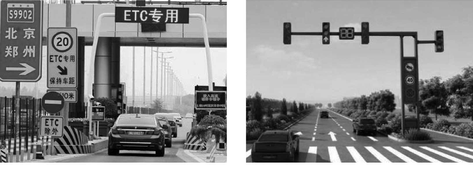 Кроме того, автоматические системы взимания платы за проезд на автомагистралях (ETC), системы адаптивного управления сигналами и т. д. также являются продуктами интеллектуальной эпохи. Среди них система адаптивного управления сигналами представляет собой интеллектуальную систему управления дорожным движением, которая в основном используется для оптимизированного и скоординированного управления дорожных светофоров в крупных и средних городах. Система обнаруживает информацию о дорожном потоке через детекторы, а затем передает эти данные на главный компьютер через сеть в режиме реального времени. Главный компьютер генерирует оптимальный план синхронизации зеленого света в реальном времени и применяет его на практике, что может максимизировать движение транспортных средств в пределах города. Или минимизировать другие показатели оценки управления движением (например, задержки, количество остановок) и т. д. Этот метод управления подходит для использования в региональном управлении или координации магистральной линии. Главный компьютер может координировать несколько сигналов перекрестка, чтобы план работы можно было адаптивно корректировать в соответствии с изменениями транспортного потока, тем самым повышая общую эффективность работы магистральной линии. Система ETC и система адаптивного управления сигналами показаны на рисунке 1-13.