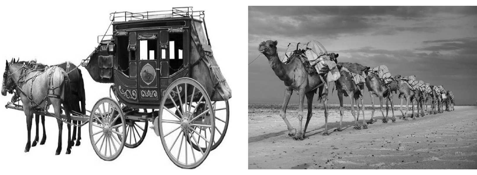 Позже, с развитием общества, люди постепенно приручили некоторых животных (лошадей, верблюдов и т. д.), и появился гужевой транспорт, такой как конные экипажи. Это можно расценивать как «огромный» скачок в истории транспорта. Это также относительно облегчило межплеменные и междинастические обмены и способствовало дальнейшему развитию общества. Технологиями, способствующими развитию средств передвижения на этом этапе, была энергия биомассы, материалы и производство машин, а сельскохозяйственная цивилизация сформировалась благодаря использованию энергии биомассы при помощи транспорта, приводимого в движение животными. Повозки, запряженные лошадьми, и верблюжьи караваны показаны на рисунке 1-7.