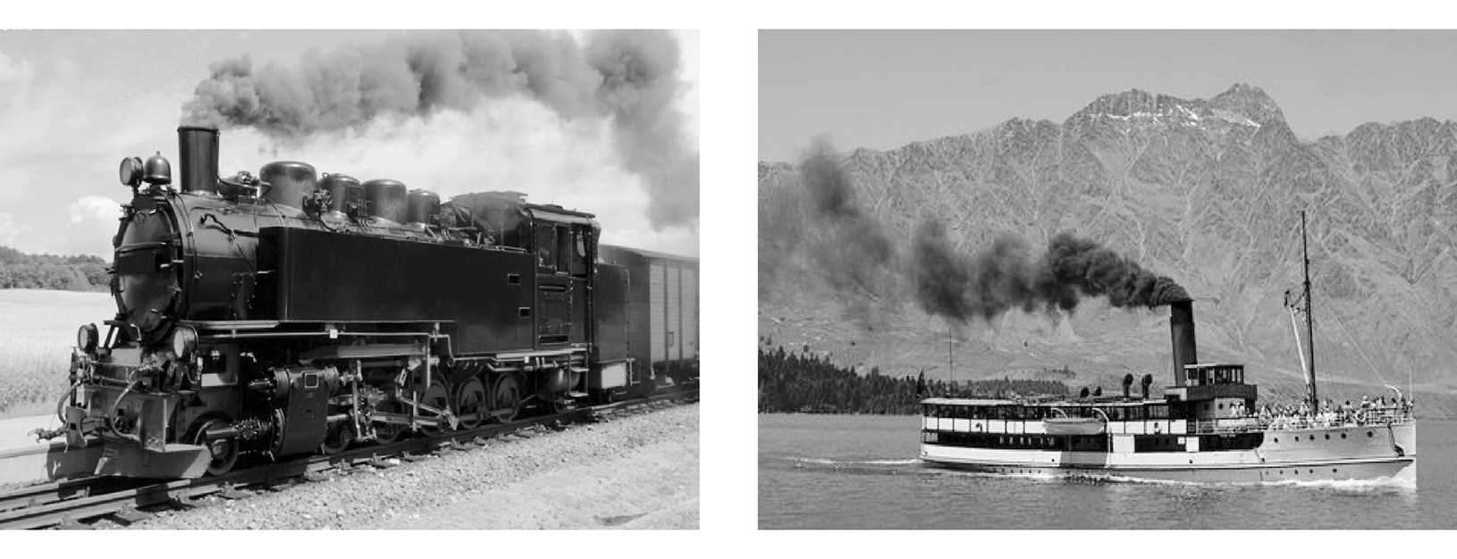 Паровой двигатель сыграл огромную историческую роль. Он способствовал развитию механической промышленности и даже общества, решил основные и ключевые проблемы производства больших машин, способствовал беспрецедентному прогрессу на транспорте. В то же время промышленная революция возникла отчасти благодаря усовершенствованию парового двигателя, а паровой локомотив – благодаря усовершенствованию парового двигателя и его применению последующими поколениями. В то время Британия поощряла изобретения, и когда население увеличилось и скорость производства увеличилась, люди начали усердно работать над улучшением производственного оборудования. Серия технологических революций, вызванных усовершенствованием Уаттом парового двигателя, привела к переходу от ручного труда к машинному производству. Таким образом, усовершенствование парового двигателя стало одной из причин промышленной революции. Паровоз – это железнодорожный локомотив, использующий в качестве источника энергии паровую машину. Поэтому без совершенствования паровой машины рождение этого средства передвижения было бы невозможно. Паровозы и пароходы показаны на рисунке 1-10.