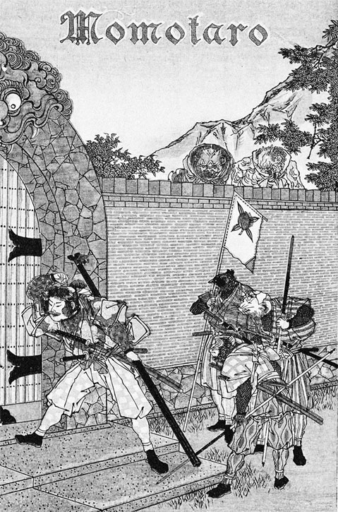 Момотаро сидел на камне, а его маленькая армия из трех солдат стояла рядом, держа его веер, поскольку он, подбоченясь, уперся руками в колени, как это делают великие полководцы после битвы, когда враг уже сдался. С правой стороны колено преклонила верная обезьяна, в то время как фазан и собака расположились слева.