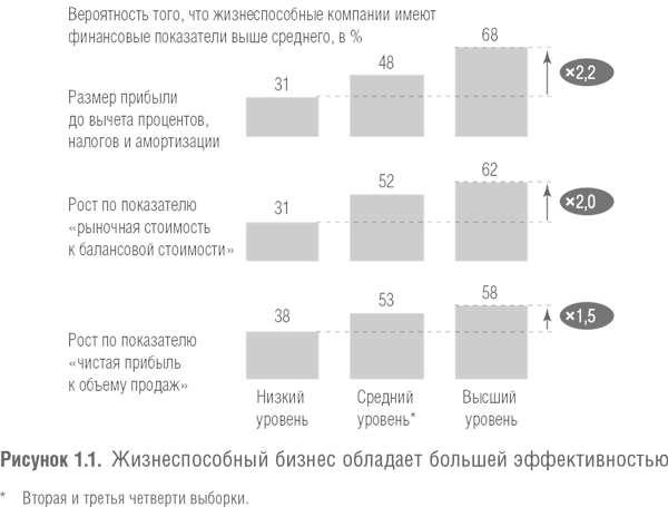 Важность поддержания жизнеспособности организации на высоком уровне легко доказать примерами из жизни. Когда мы занимались поиском связей между эффективностью и жизнеспособностью бизнеса для самых разных параметров, мы легко находили их почти повсюду. Например, компании в верхнем квартиле по уровню жизнеспособности с более чем двукратной вероятностью имели показатели EBITDA (прибыль до вычета процентов, налогов и амортизации) выше среднего, в два раза чаще имели рост рыночной стоимости компании относительно балансовой стоимости выше среднего, и в 1,5 раза чаще имели выручку от продаж выше среднего (рис. 1.1). За пределами США коэффициенты корреляции показали, что почти в 50 % случаев разница в эффективности компании вызвана различной жизнеспособностью бизнеса.