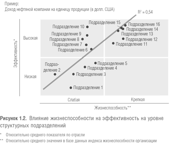 Наши результаты исследований выборки компаний отражают и результаты исследований внутри отдельных компаний. Мы занимались анализом корреляции между эффективностью и жизнеспособностью компании для 16 нефтеперегонных заводов интернациональной нефтяной компании. В результате проделанной работы мы выяснили, что различия в эффективности работы предприятий в 54 % случаев связаны с показателями жизнеспособности организации (рис. 1.2).