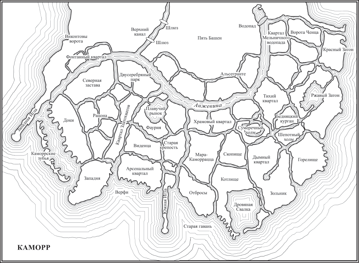 Маленький Ламора со своими товарищами из Горелища впервые вступил в это царство спустя два десятка лет после его основания. Кладбище представляло собой обширное скопление неглубоких старых склепов, соединенных между собой сетью подземных тоннелей и галерей, чьи плотно утрамбованные стены были укреплены частыми опорами, похожими на ребра давно истлевших драконов. Исконных обитателей кладбища уже давно повытаскивали из гробниц и побросали в залив под покровом ночи, и ныне Сумеречный холм превратился в гигантский муравейник, населенный сиротами-воришками.