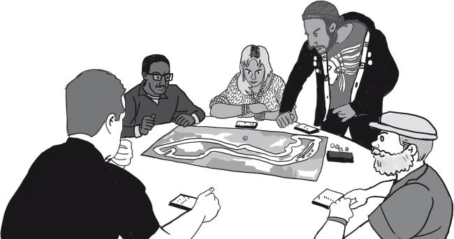 Например, во время партии в «Чартерстоун» я заметил, что игроки делали ходы ближе к своей «деревне» (на расстоянии вытянутой руки), хотя могли выбирать более выгодные места в любой части поля. Некоторые даже ни разу не встали со своих мест, чтобы рассмотреть происходящее на другом конце стола, хотя действовать там им было бы намного выгоднее. Такая же ситуация произошла во время партии в Formula D. Те, кто играл впервые, оставались на своих местах, пока до них не дошло, что нужно вставать и перемещаться вокруг стола, чтобы управлять своими автомобилями. (А иногда игрок даже просил соперника передвинуть свою фишку за себя!)
