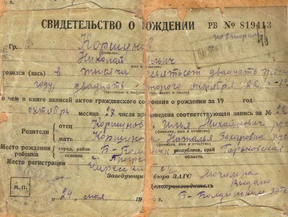 Свидетельство о рождении Коршунова Николая Ильича от 22.10.1925 года