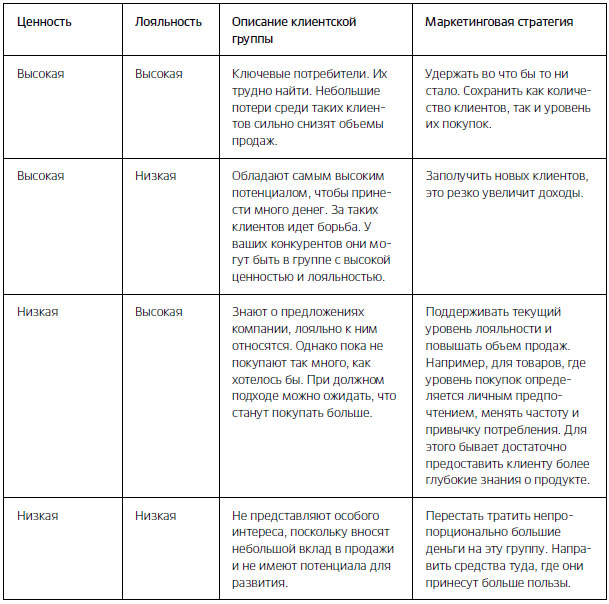 Пусть «ценность» и «лояльность» принимают два значения: «низкая» и «высокая». Две переменные с двумя значениями дадут четыре группы людей. Они задают направление для распределения ресурсов маркетинга. Познакомимся с ними.