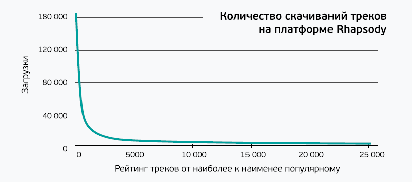 На первый взгляд, кривая выглядела вполне обычно – брала начало в левом верхнем углу, где располагались самые часто скачиваемые треки, и резко уходила вниз, как будто доказывая правило Парето, согласно которому 80 % треков генерируют всего 20 % прибыли.