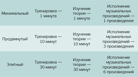 Игра на скрипке – гибкая привычка. Ее формирование включает три вида деятельности: тренировку, изучение теории и проигрывание музыкальных произведений (располагаются по горизонтали). У каждого вида деятельности есть три уровня: минимальный, продвинутый и элитный (по вертикали).