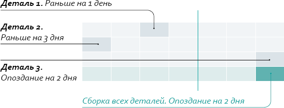 Если одна из трех деталей, участвующих в сборке, будет готова на два 2 позже, не имеет значения, что другие детали будут готовы раньше.